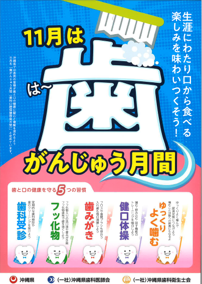 沖縄県では、県民の皆様が歯科口腔保健について関心と理解を深めるよう11月を「歯科口腔保健啓発月間」と定めました。(沖縄県歯科口腔保健の推進に関する条例第9条)
