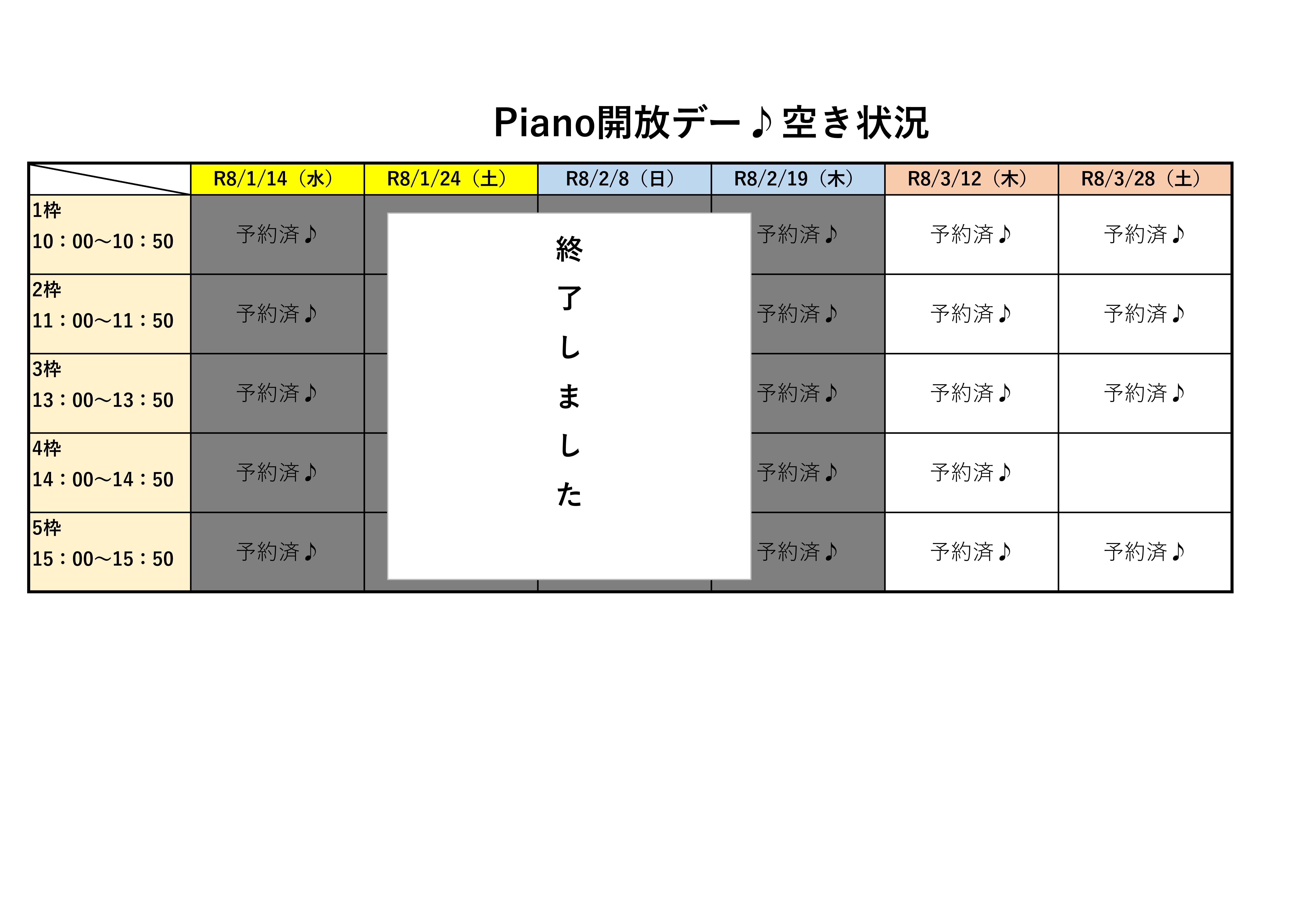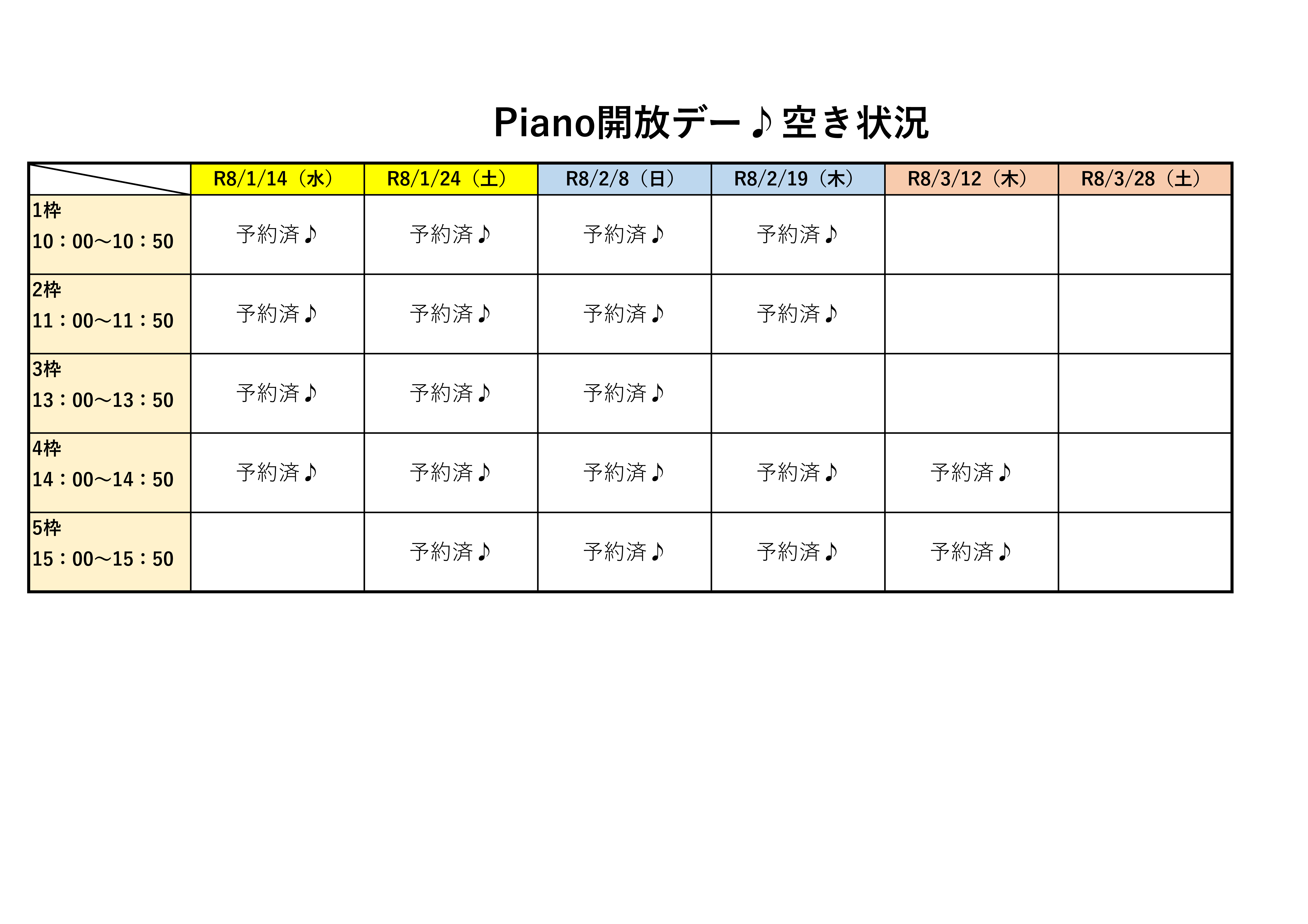 各ピアノ開放日5組(1枠~5枠までの時間区分) ・1枠につき1組 ・1組最大5名程度・ピアノ演奏者と合同練習可能 (器楽・歌など) |
