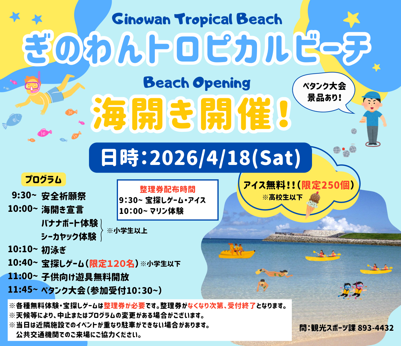 4月18日(土曜日)に「ぎのわんトロピカルビーチ海開き」を開催します!🏖️✨