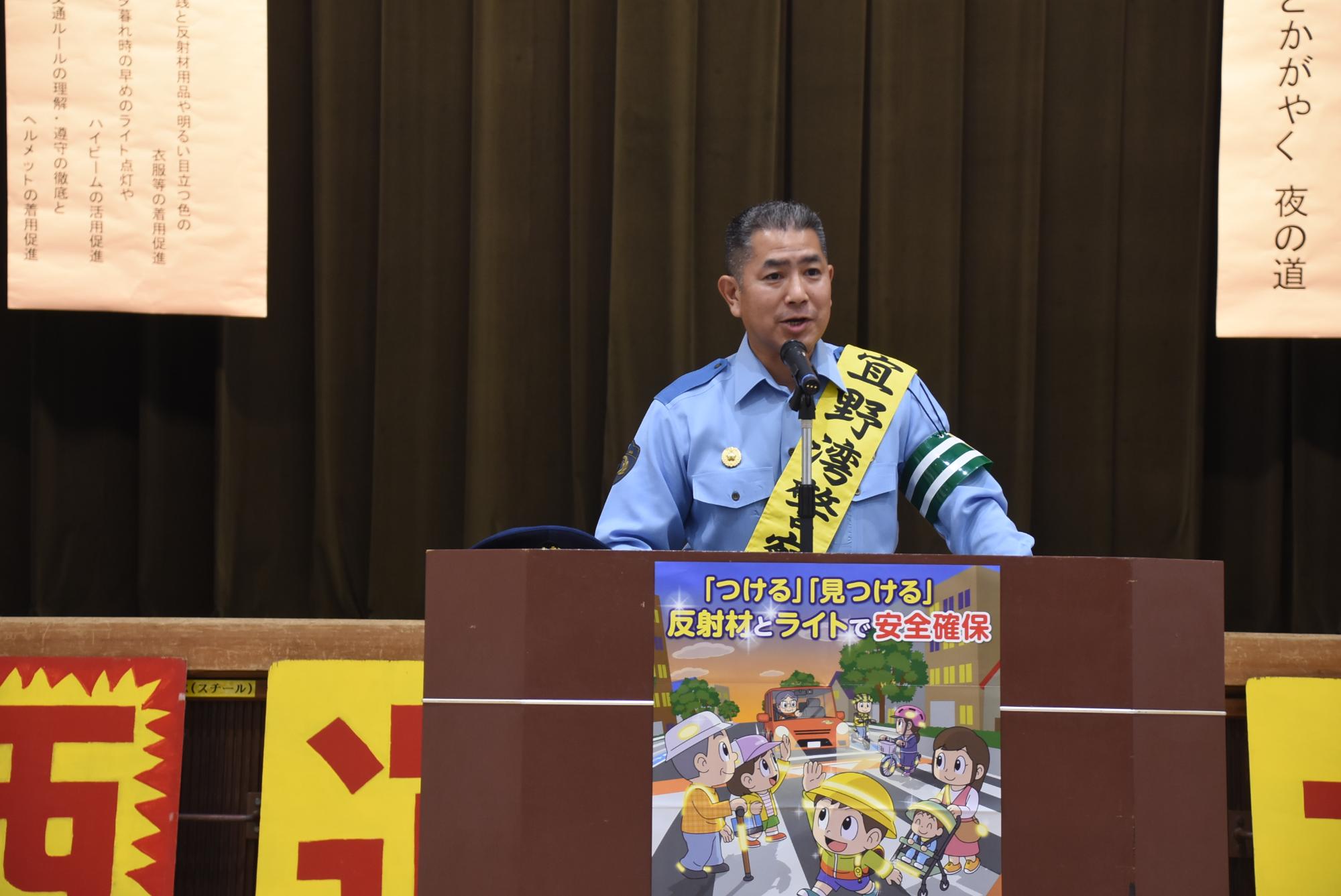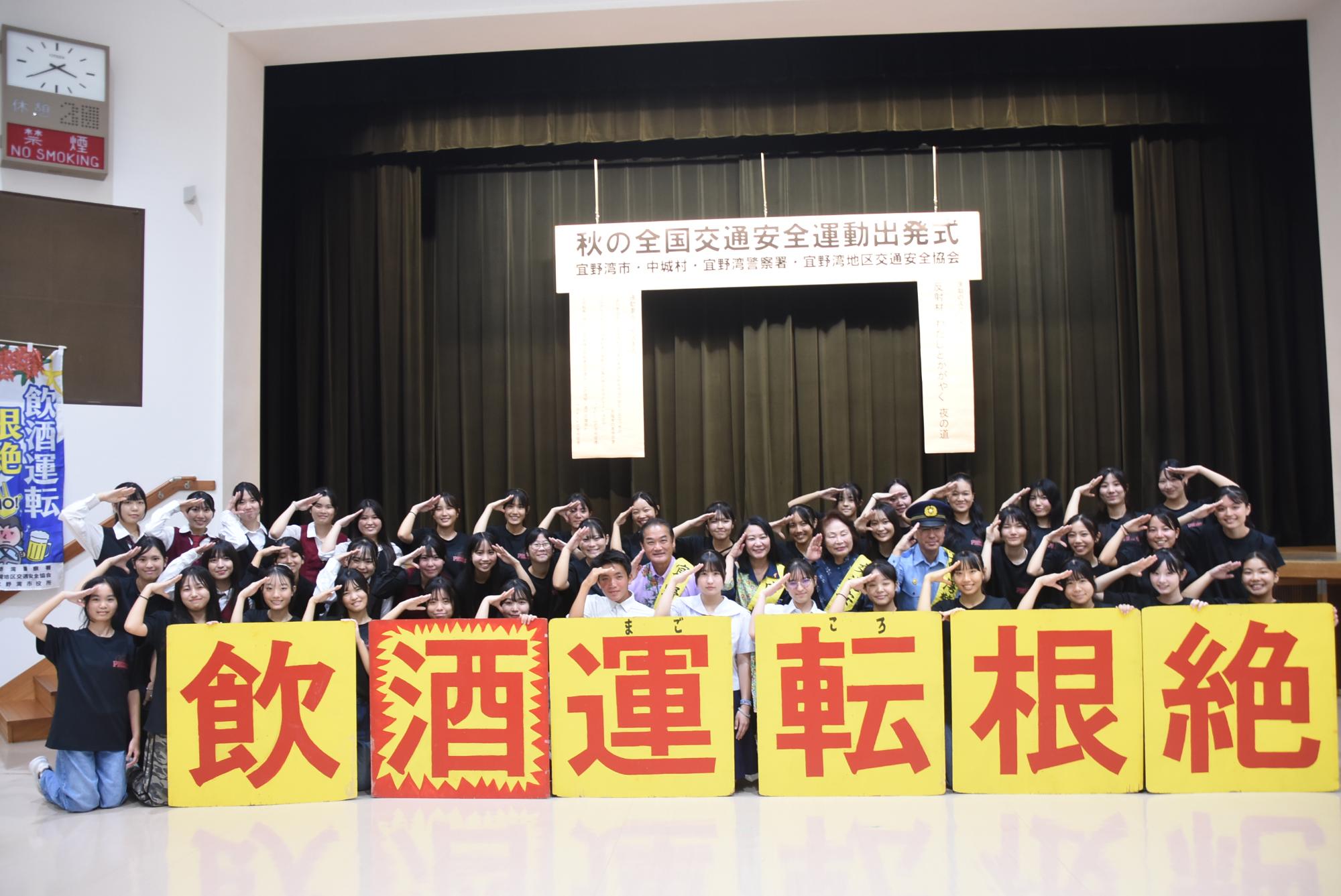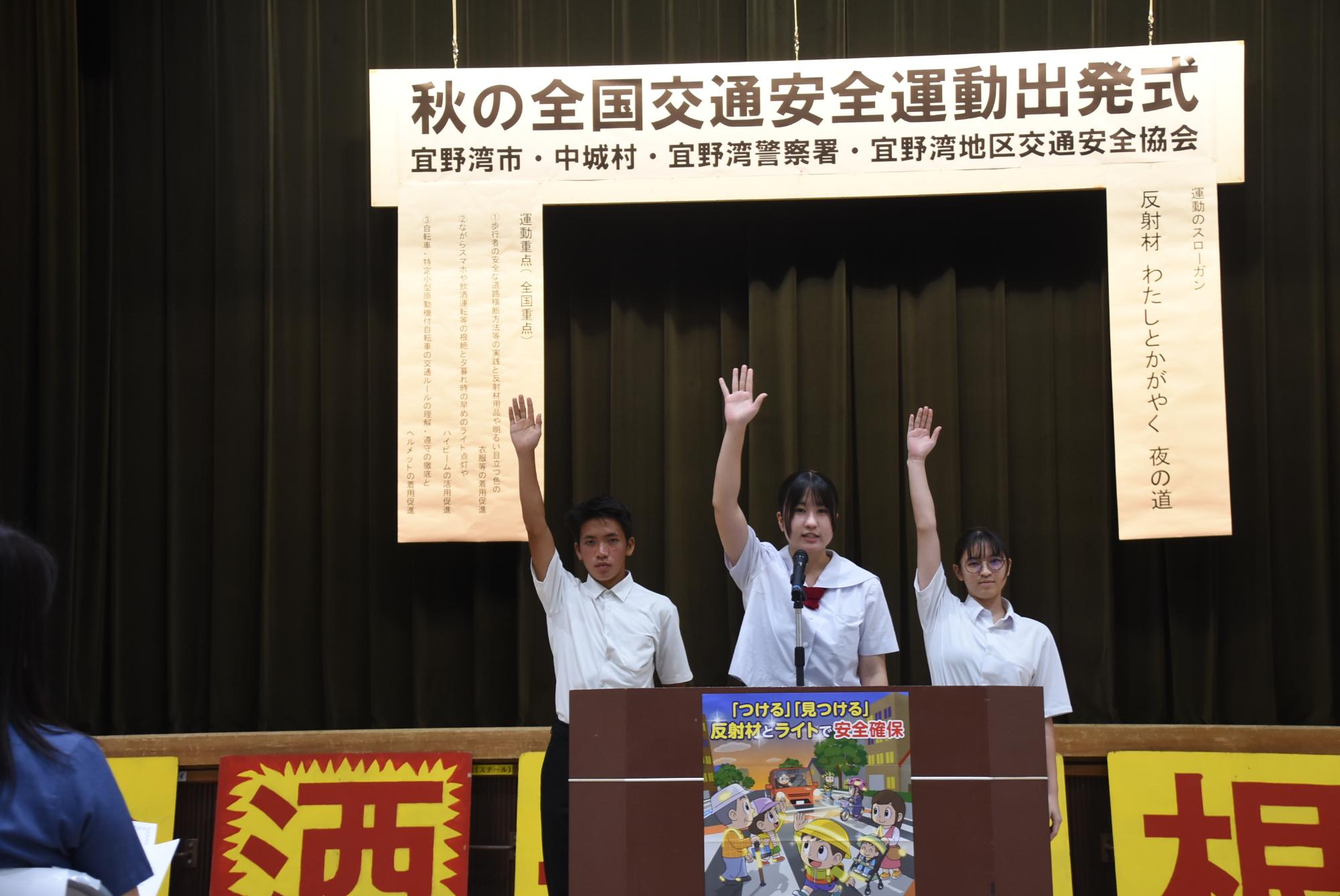 交通事故防止の徹底に向け、普天間高校生徒会による交通安全宣言が行われ、「交通事故のない、安心・安全な宜野湾市そして沖縄県であり続けることを願います」と力強く宣言してくれました。