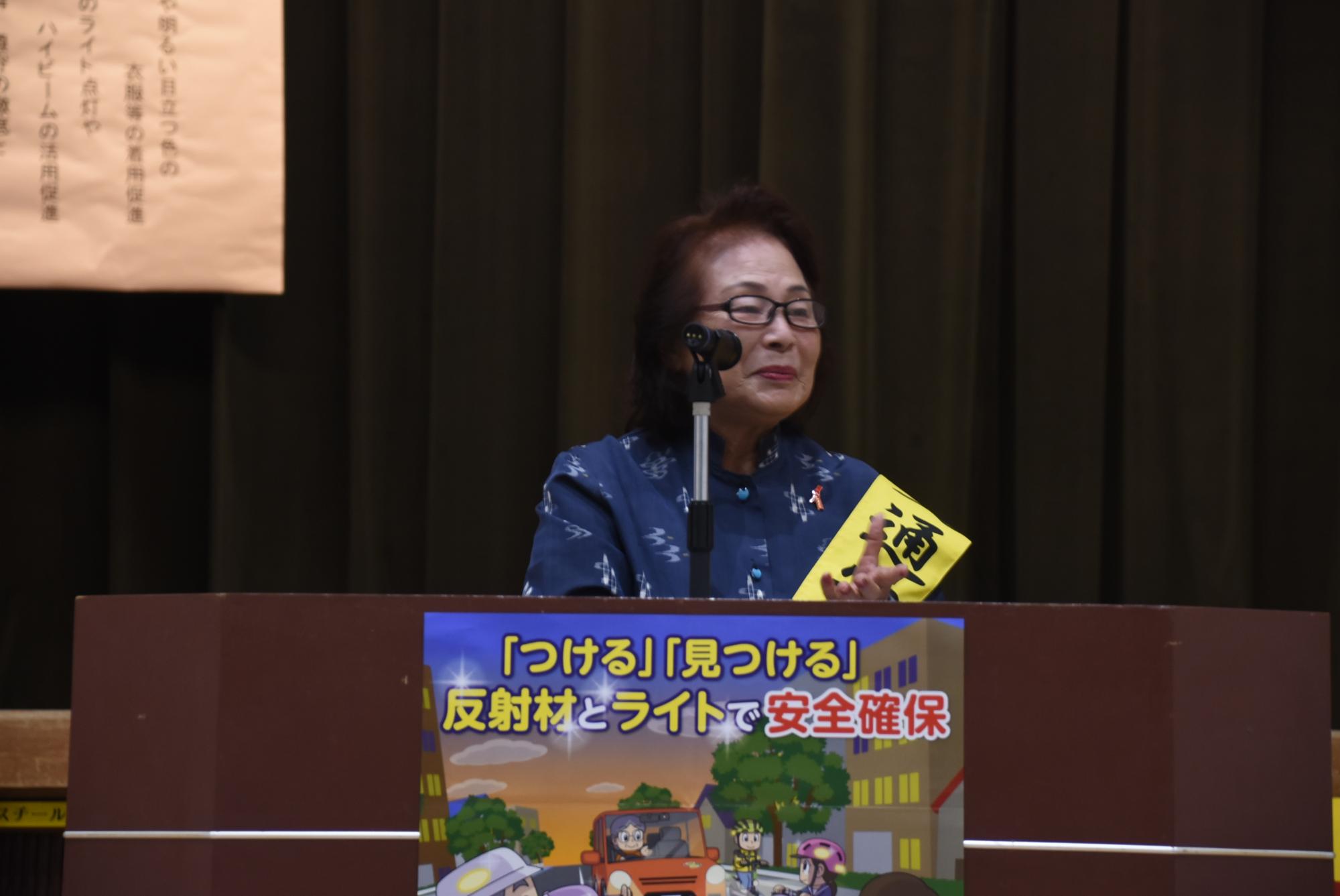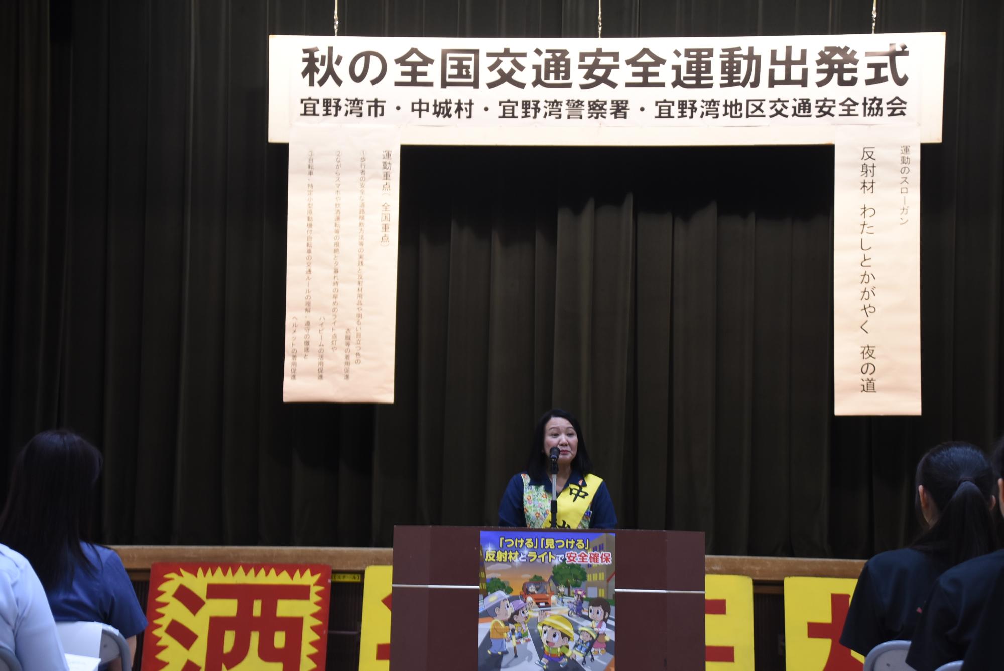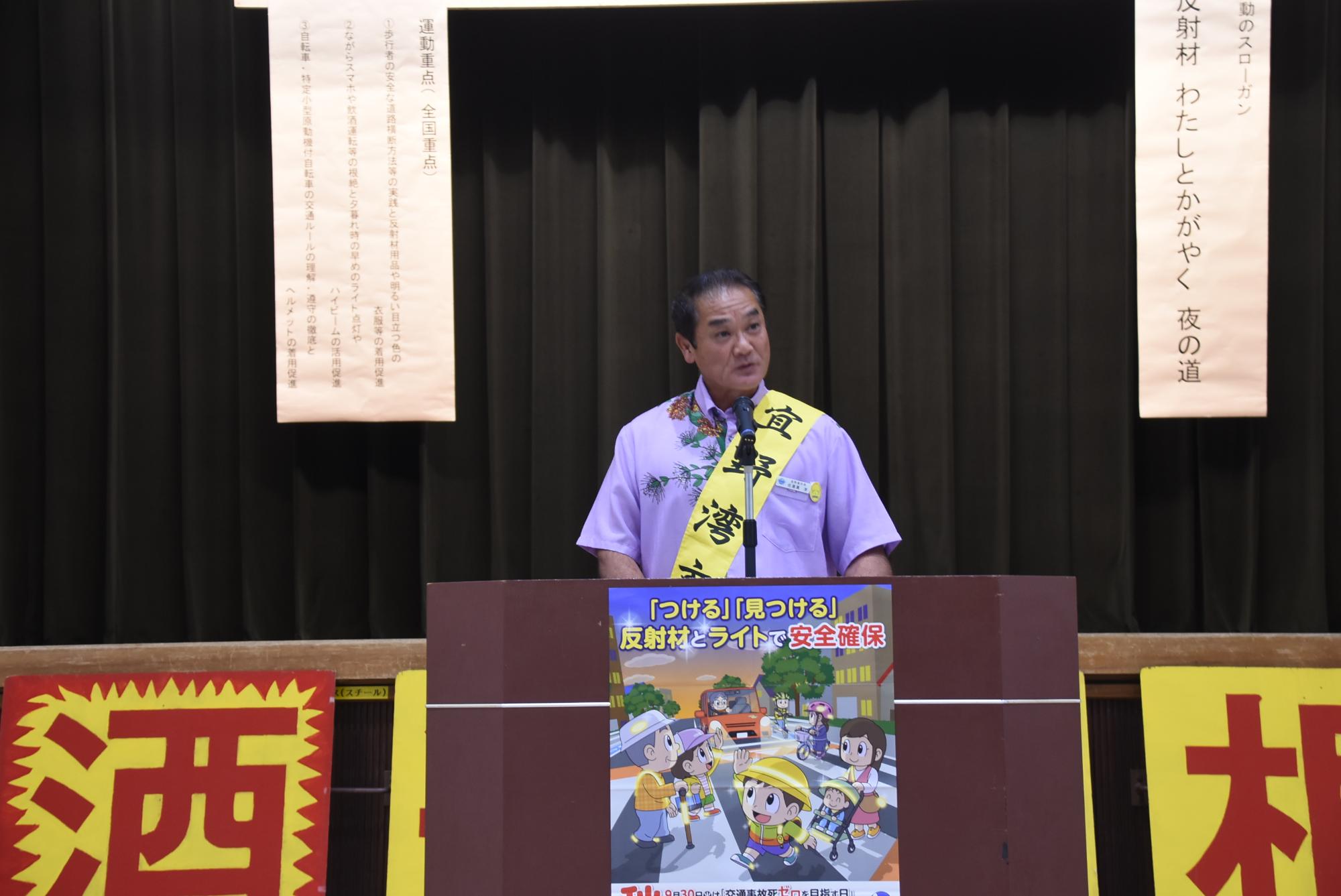 開催地を代表して佐喜眞市長は「本市と中城村、関係団体、関係機関の皆さまが一致団結し、交通事故ゼロを目指しましょう」とあいさつしました。