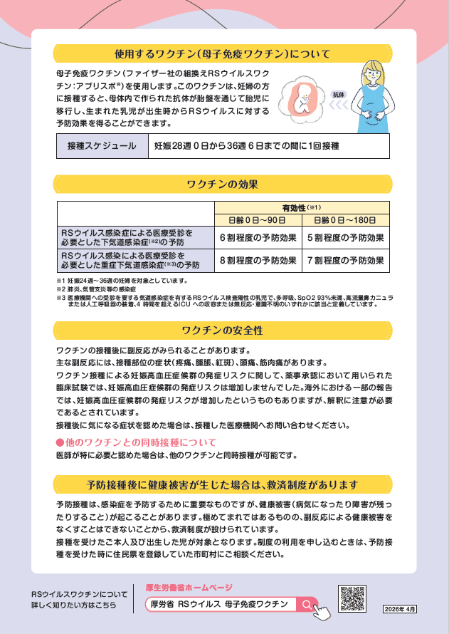 令和8年4月1日から、「妊娠28週0日~妊娠36週6日の妊婦さん」を対象にRSウイルス感染症に対する母子免疫ワクチンの定期接種を実施します。