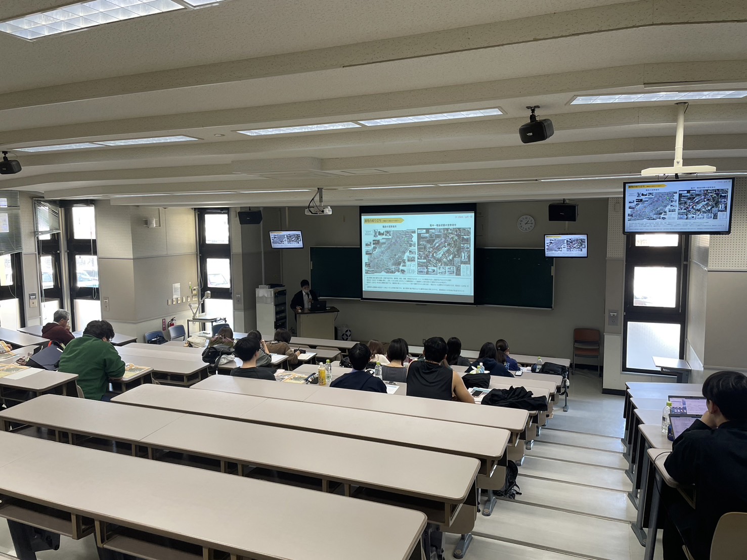 普天間飛行場の概要、成り立ち、基地被害、跡地利用等について行政の立場から説明を行い、その後質疑応答を行いました。質疑応答では学生から多くの質問があり、普天間飛行場の現状や課題について回答しました。