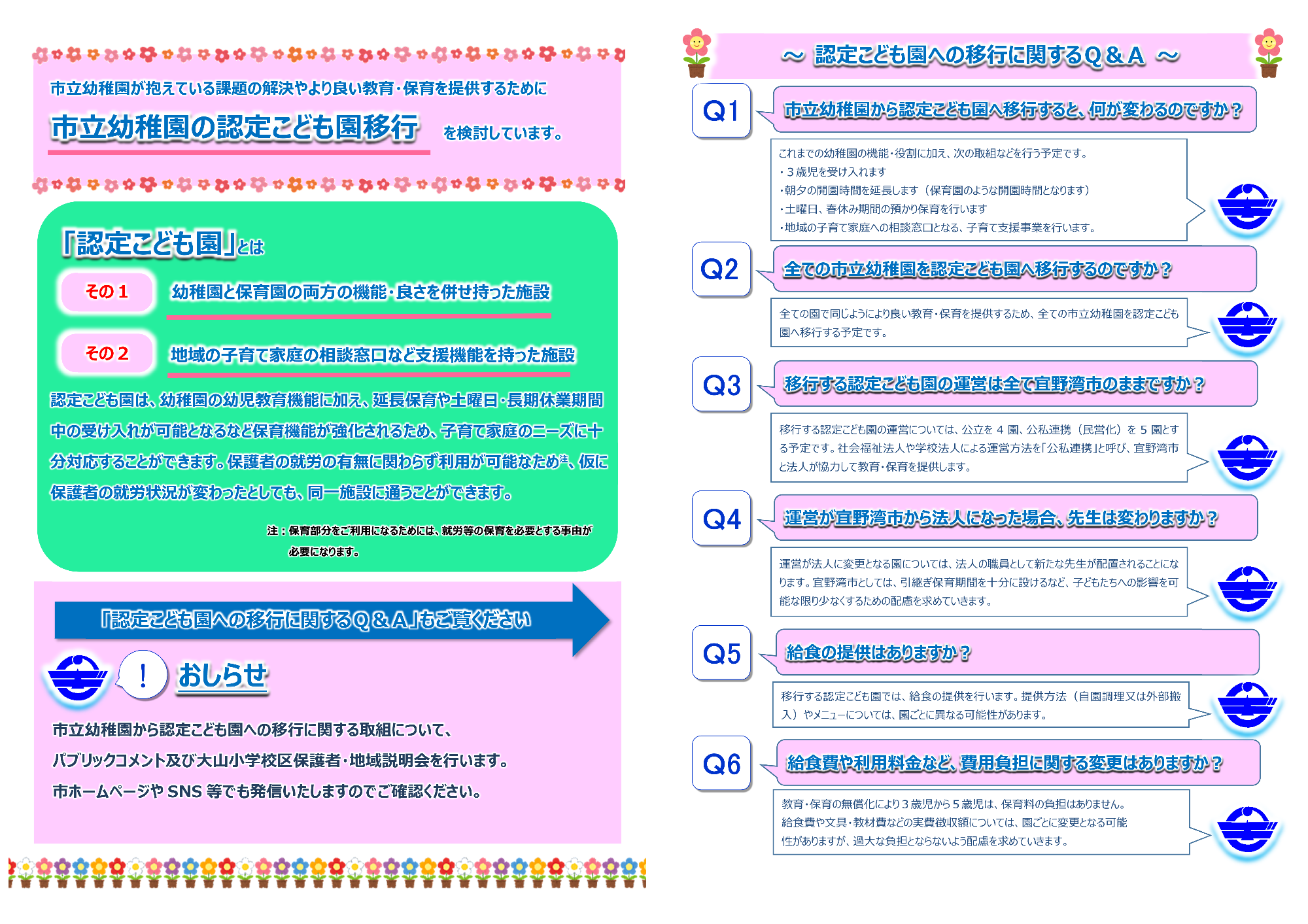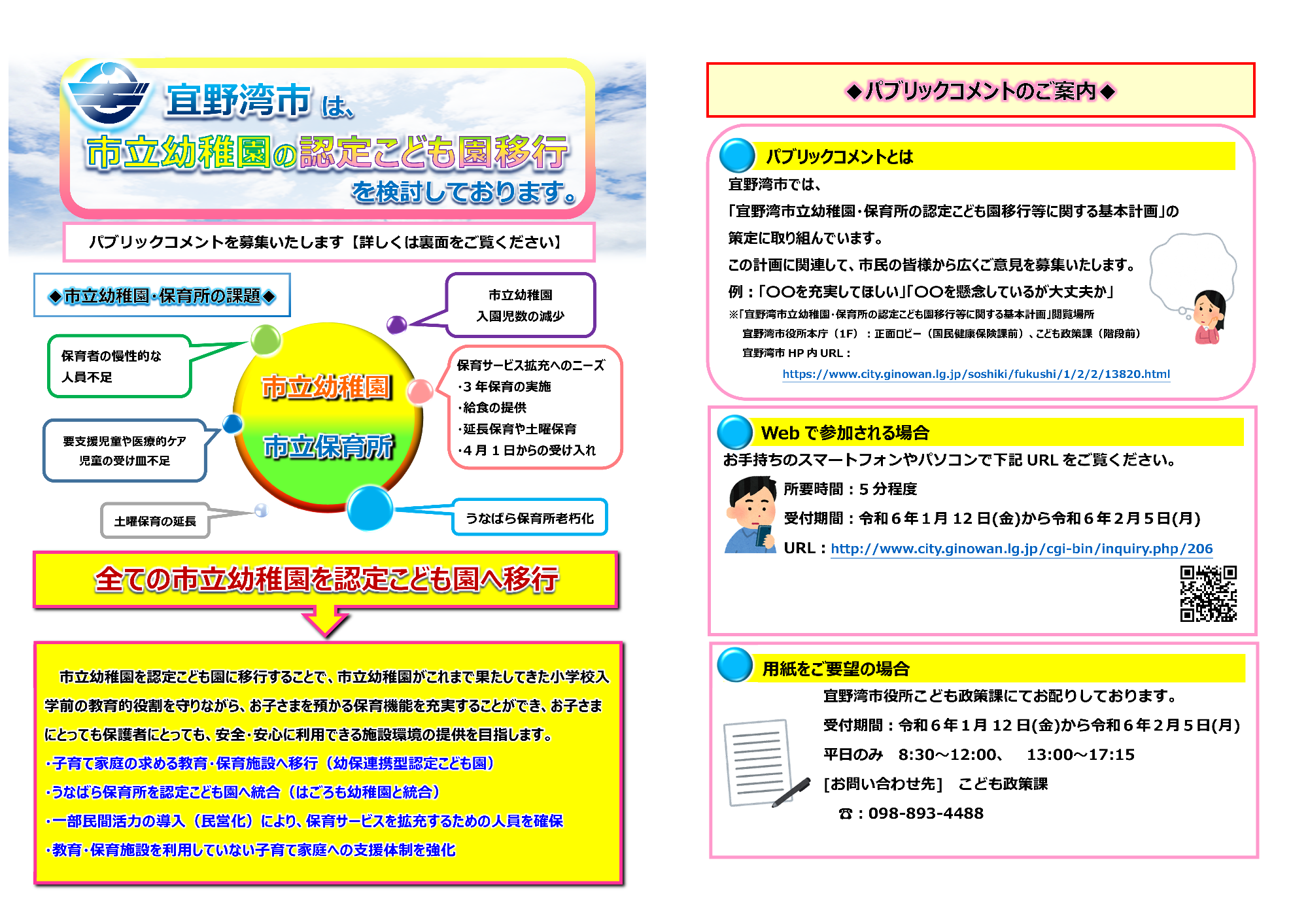 市では、現状課題を解決するため、市立幼稚園を子育て家庭が求める教育・保育機能を併せ持つ認定こども園へ移行すること、うなばら保育所を公立の認定こども園に統合することの検討を進めており、この度、「宜野湾市立幼稚園・保育所の認定こども園移行等に関する基本計画(素案)」を策定しました。