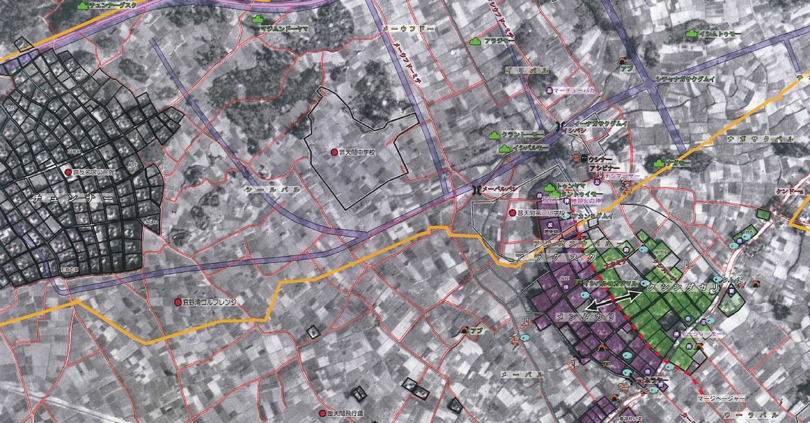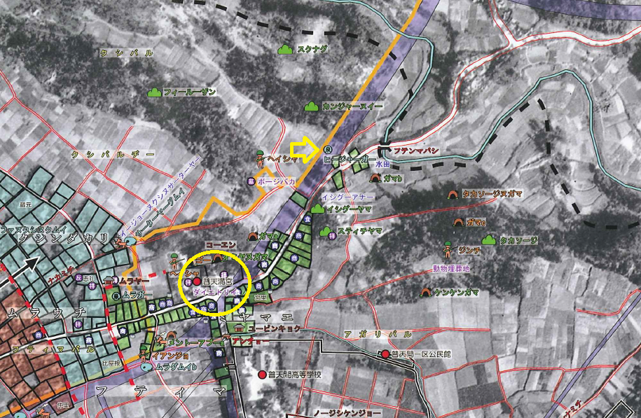 そうなんです、沖縄戦で土地を接収される前までは、新城集落はジノーンナンマチ(宜野湾並松)沿いにありました。(↑の写真 現在の普天間第二小学校のあたり)