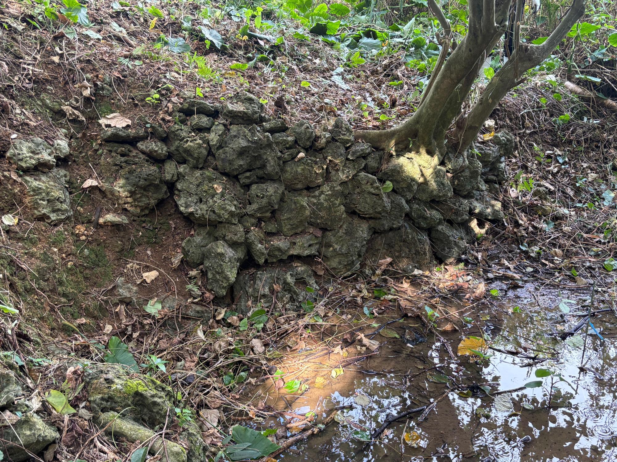 また、石積みの下に見える水場はかつての水路跡だと考えられます。
