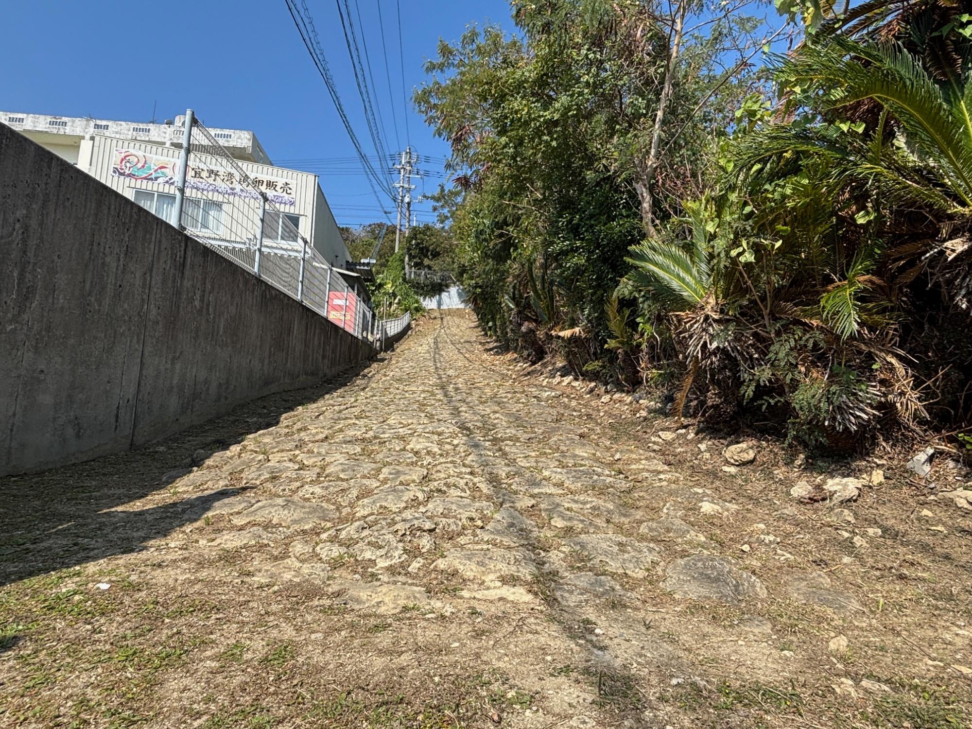 宜野湾の野嵩から中城へとつながる古道の一部です。高低差34m、長さ120mという急な坂道に造られた石畳道なんです。現在は県道を挟んで東側を歩くことができますが、西側の整備も近々始まる予定ですので、その進捗状況もお伝えしていきますね🫡