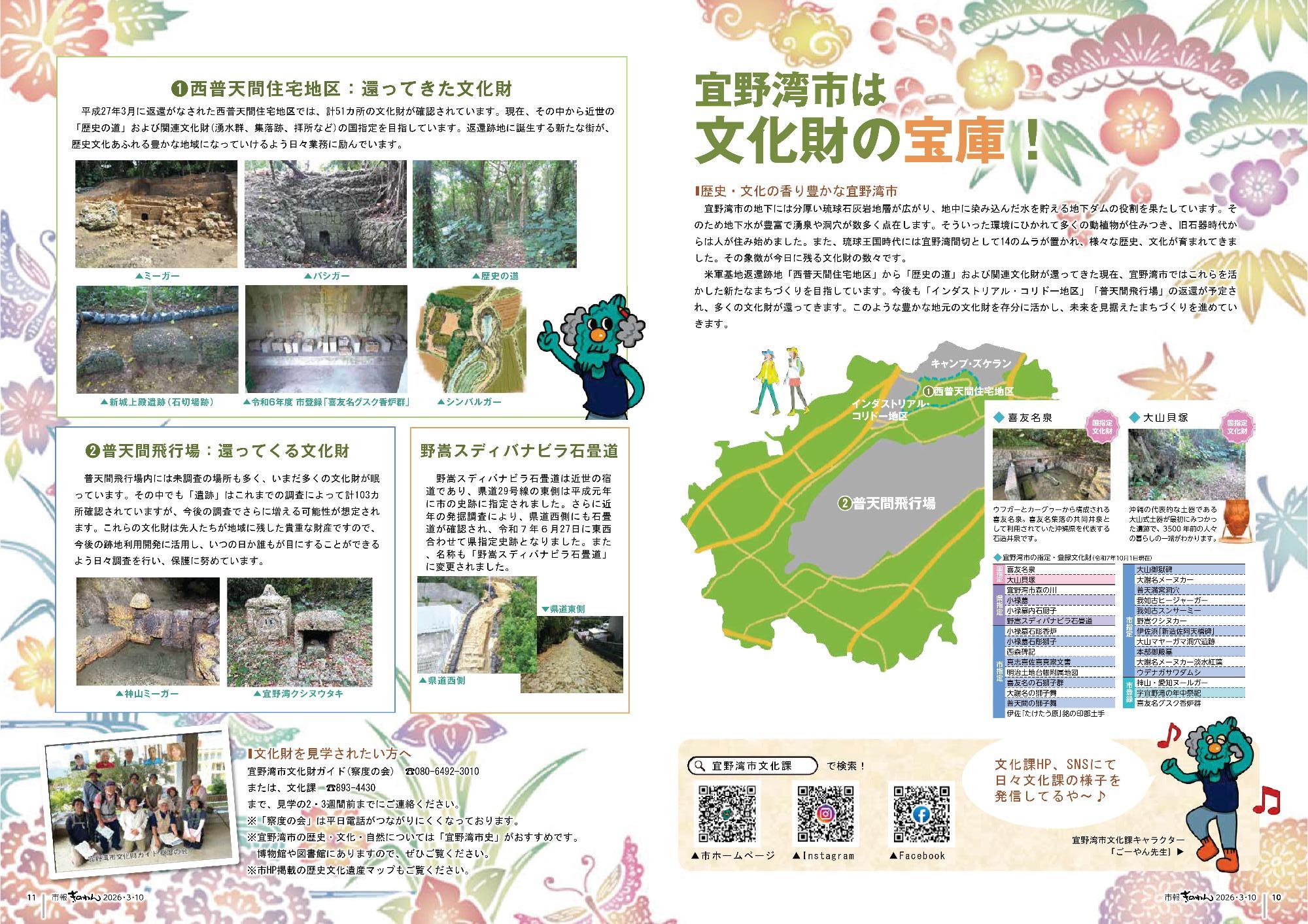 特集タイトルを「宜野湾市は文化財の宝庫!」と題しまして、現在指定・登録されている宜野湾市の文化財はもちろんのこと、米軍跡地である西普天間住宅地区で発掘され、もうすぐ見ることができるようになる「還ってきた文化財」。