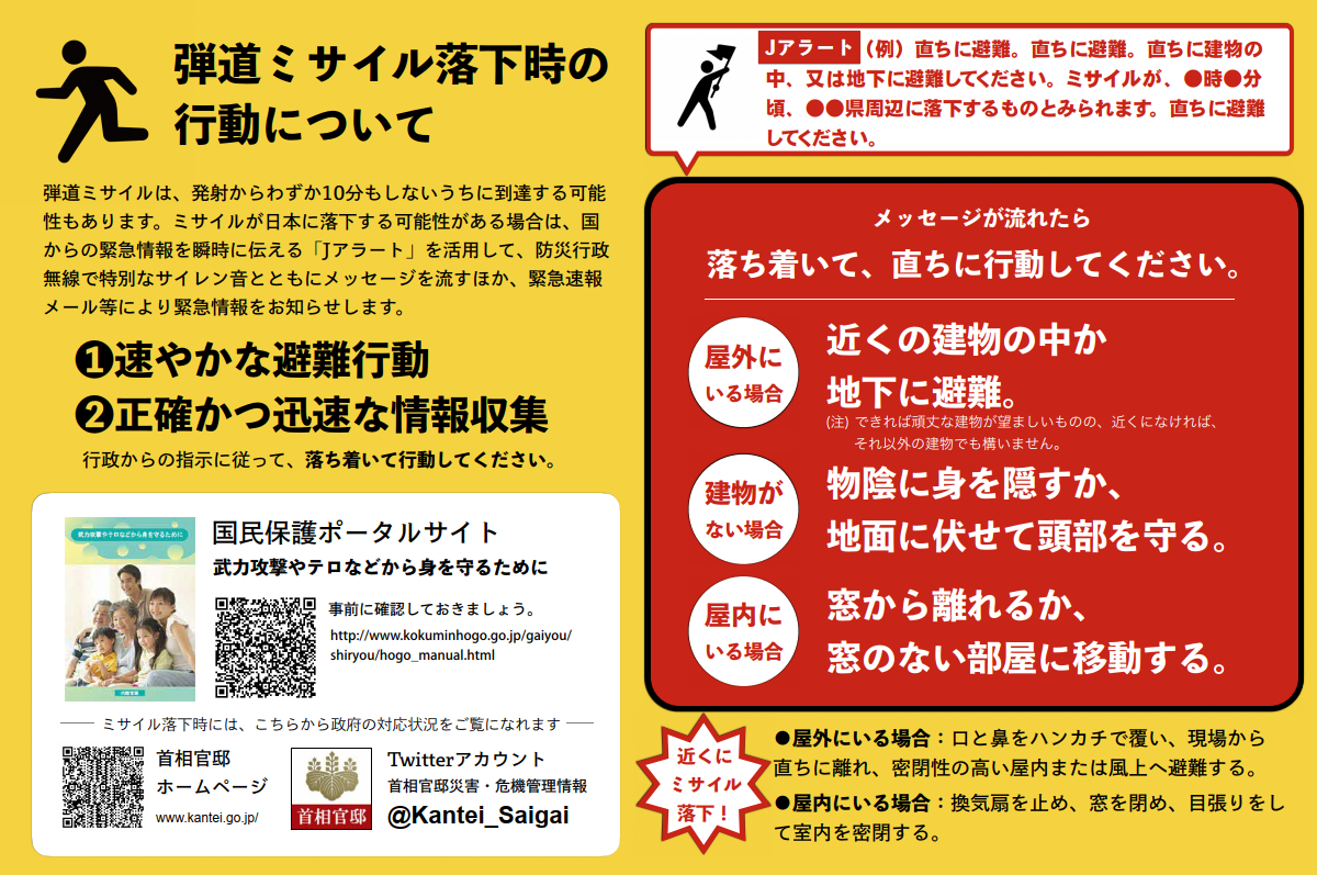 昨今の情勢を踏まえ、問い合わせが多く寄せられている、弾道ミサイルが落下する可能性がある場合に国民がとるべき行動について、お知らせいたします。